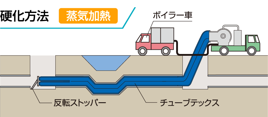 熱硬化性樹脂を含浸させた更生材を立坑から既設管内に反転させながら挿入し、既設管内で蒸気加熱により樹脂を硬化させることで新たな管を構築する更生技術です。