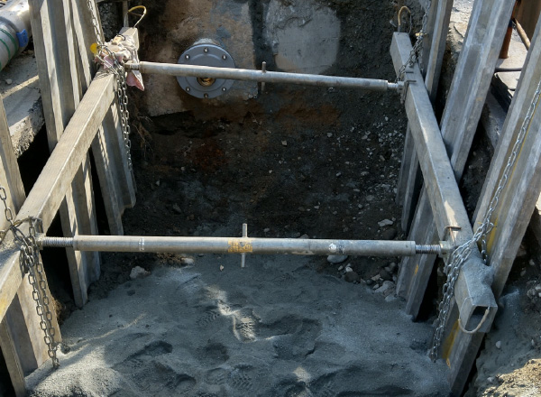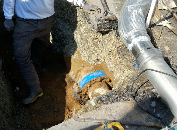 迂回配管の開通を確認し試掘に移ります。図面と違いがないか、更生の際に問題が無いか確認します。