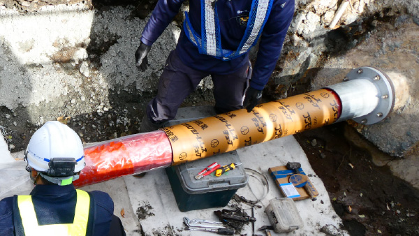 チューブテックス工法で更生後の水管橋と既設管を接続するために管口の処理を行います。