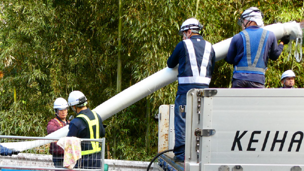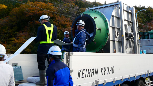 事前に熱硬化性樹脂を含浸させた部材を現場で反転機に巻き取ることで工事時間を短縮しました。